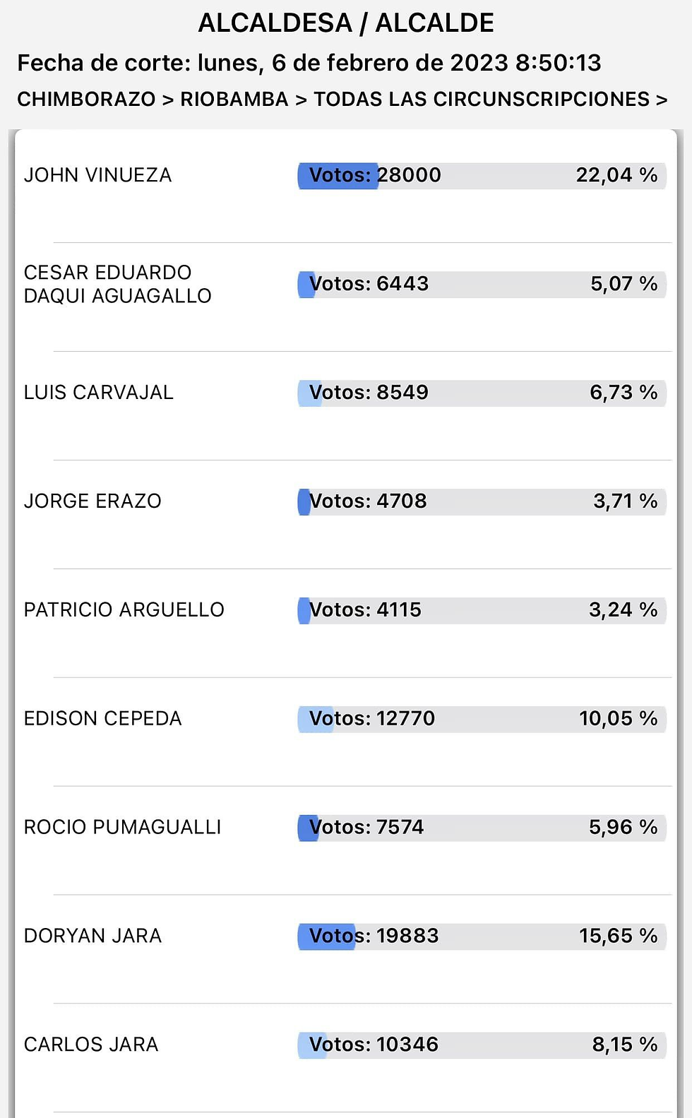 100% DE ACTAS ESCRUTADAS PARA ALCALDE EN RIOBAMBA
