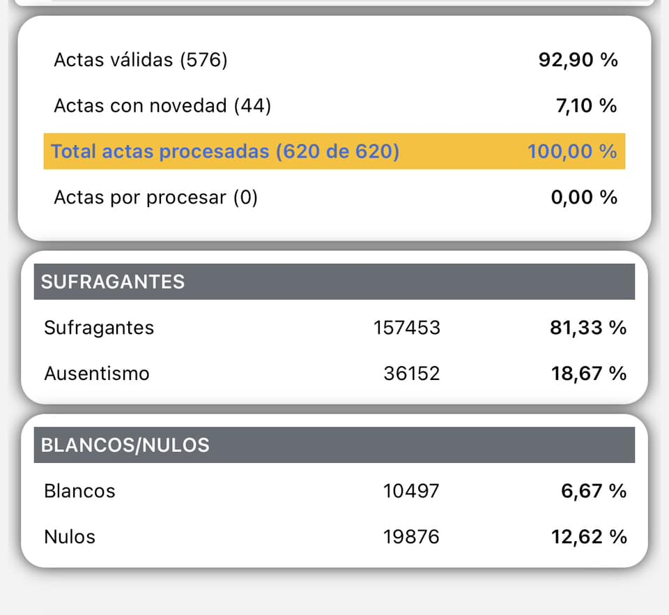 Del 100% de actas escrutadas, existieron 19.876 votos nulos correspondiente al 12.62% y 10.497 votos en blanco que suman el 6.67%.