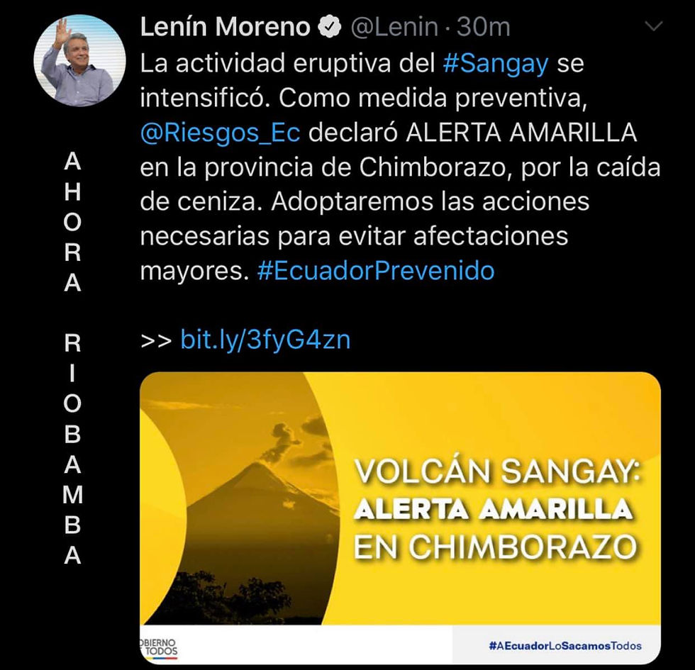 Lenín Moreno, presidente de la República informó mediante su cuenta oficial de twitter, que la Secretaria de Gestión de Riesgos declaró#AlertaAmarillaen Chimborazo, por la caída de ceniza del volcán#Sangay.