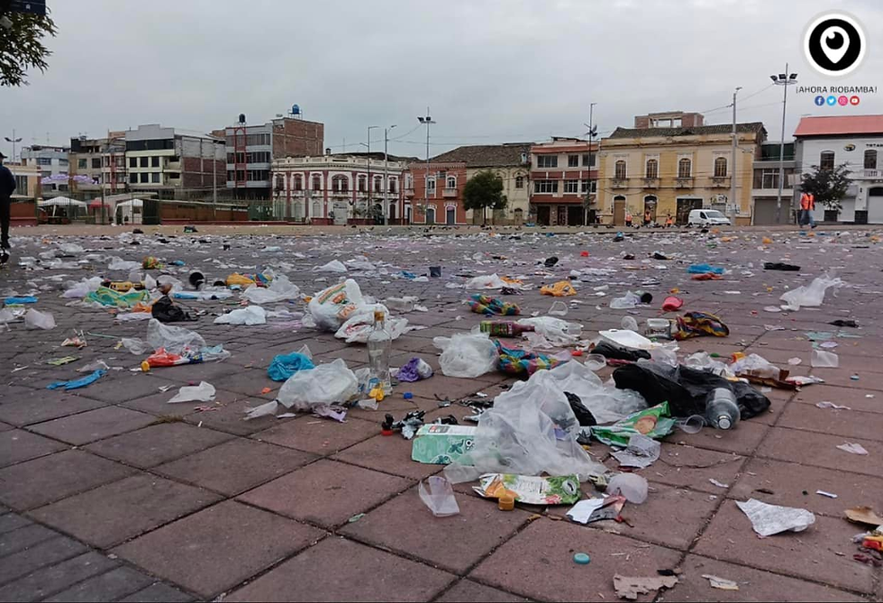 Así amanecieron las inmediaciones de la Plaza Alfaro en el centro de la ciudad este domingo 27 de febrero, luego de las festividades de carnaval celebradas en la zona.