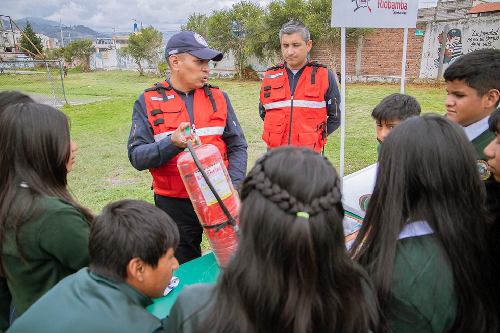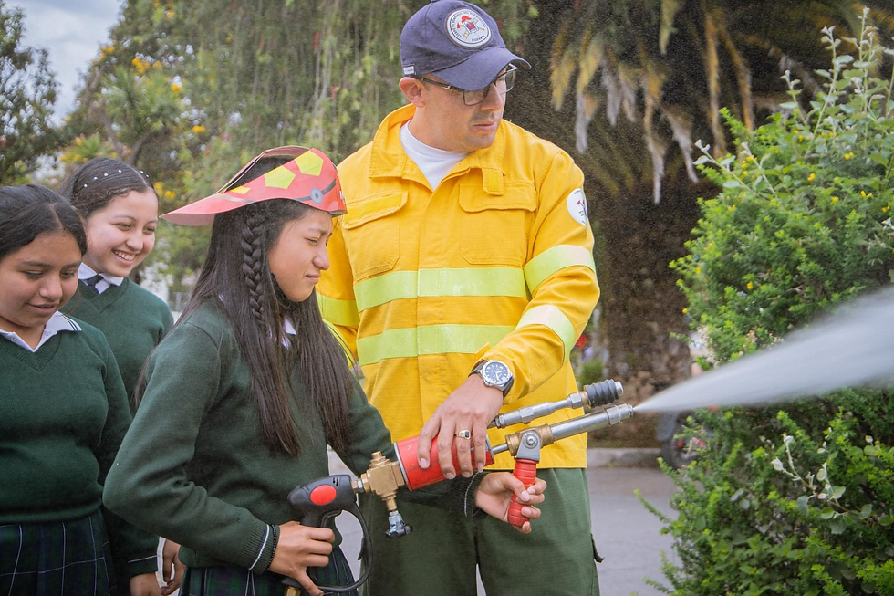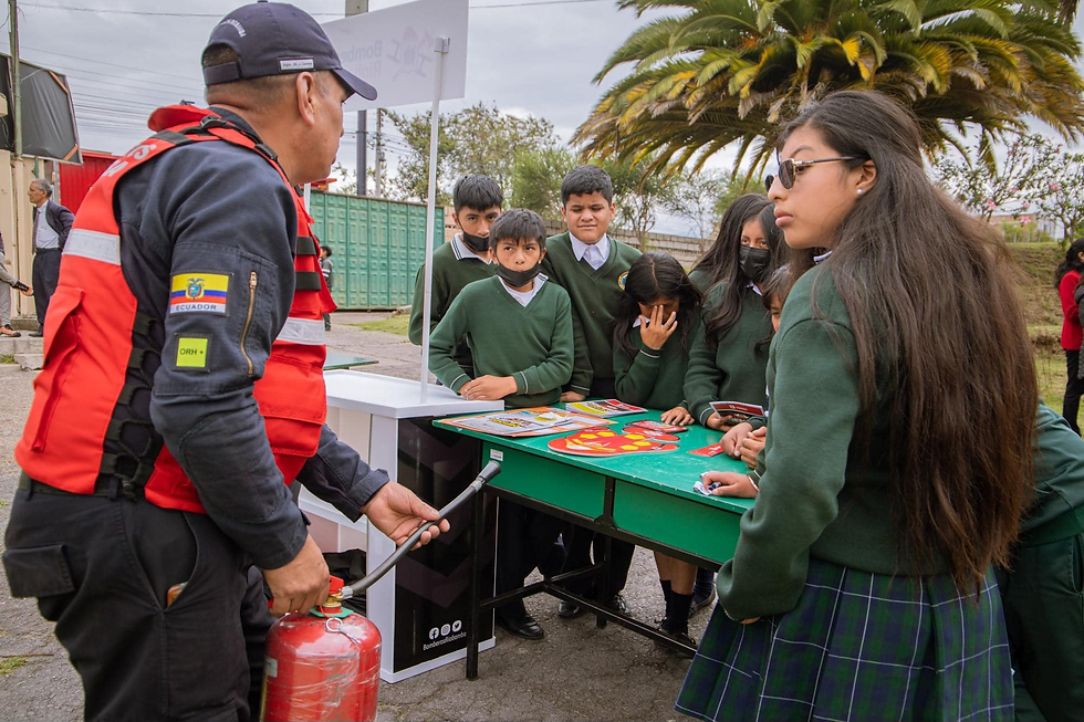 Uniformados del Cuerpo de Bomberos Riobamba brindaron una capacitación a más de 300 estudiantes de la Unidad Educativa Amelia Gallegos en temas de uso y manejo de extintores, primeros auxilios, uso de tramos de mangueras, tipos de chorros para el combate de incendios y sobre protocolos de actuación en caso de un movimiento telúrico.