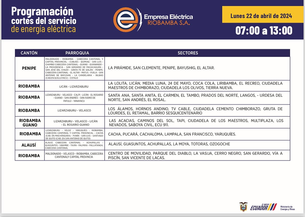 #Importante | Estos son los horarios de los cortes de energía para este lunes 22 de abril de 2024, en los diferentes sectores de la ciudad y provincia.