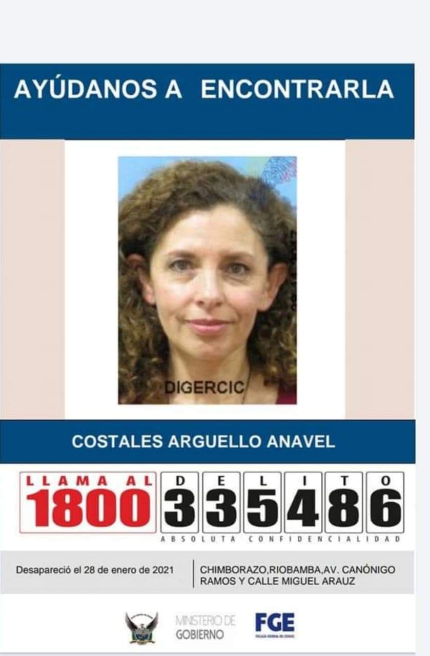 Aproximadamente al medio día de este lunes 01 de febrero de 2021, por el sector de la Unidad Educativa a Distancia de Chimborazo, ubicada al norte de Riobamba, se encontró el cuerpo sin vida de Anavel Costales Arguello, quien hace varios días fue reportada como desaparecida.