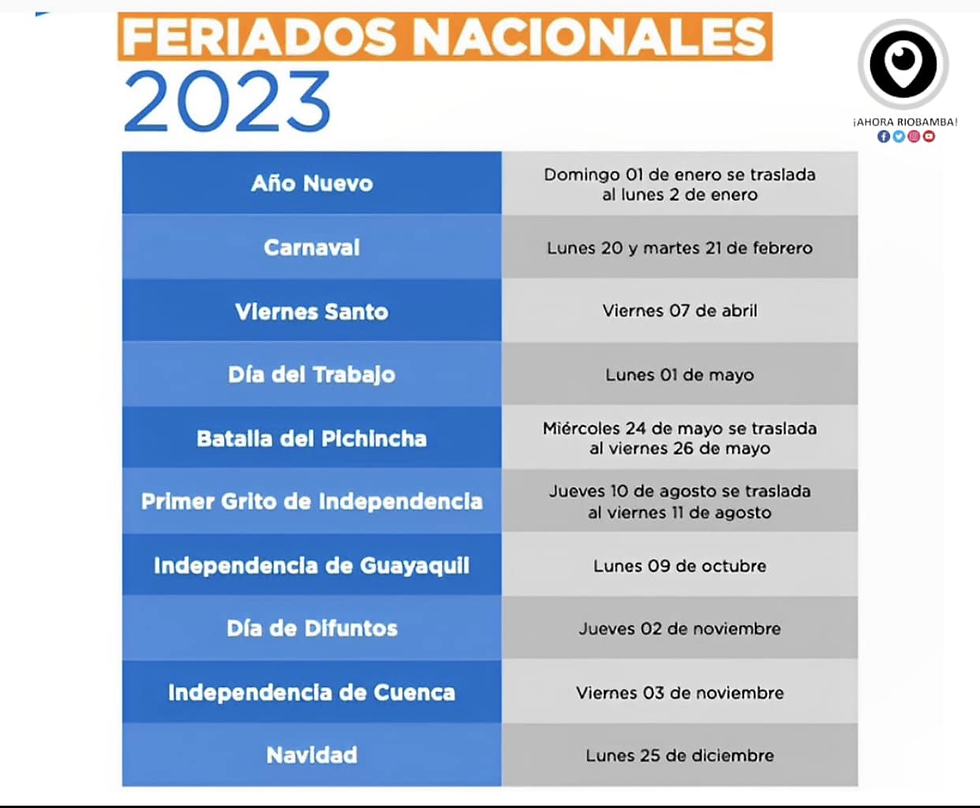FERIADOS QUE SE DISFRUTARÁN EN ECUADOR EN EL 2023
