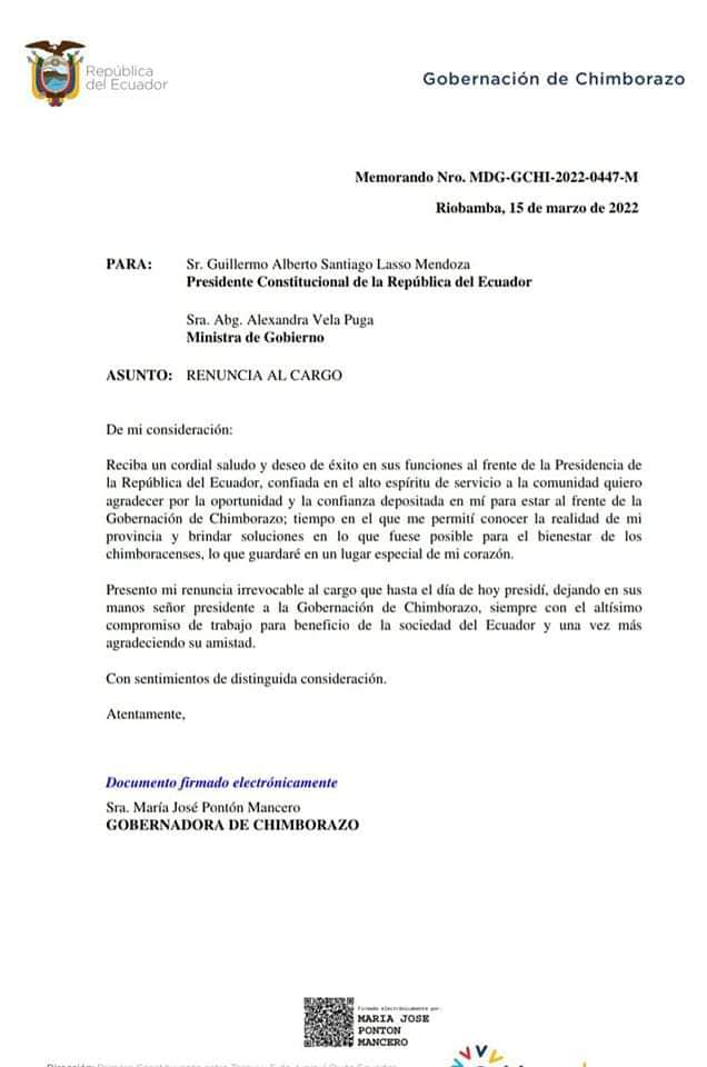 Esta mañana se conoció sobre el pedido de María José Pontón, Gobernadora de Chimborazo, quien habría solicitado a la presidencia de la República la renuncia irrevocable a su cargo. La solicitud se realizó el pasado 15 de marzo de 2022.