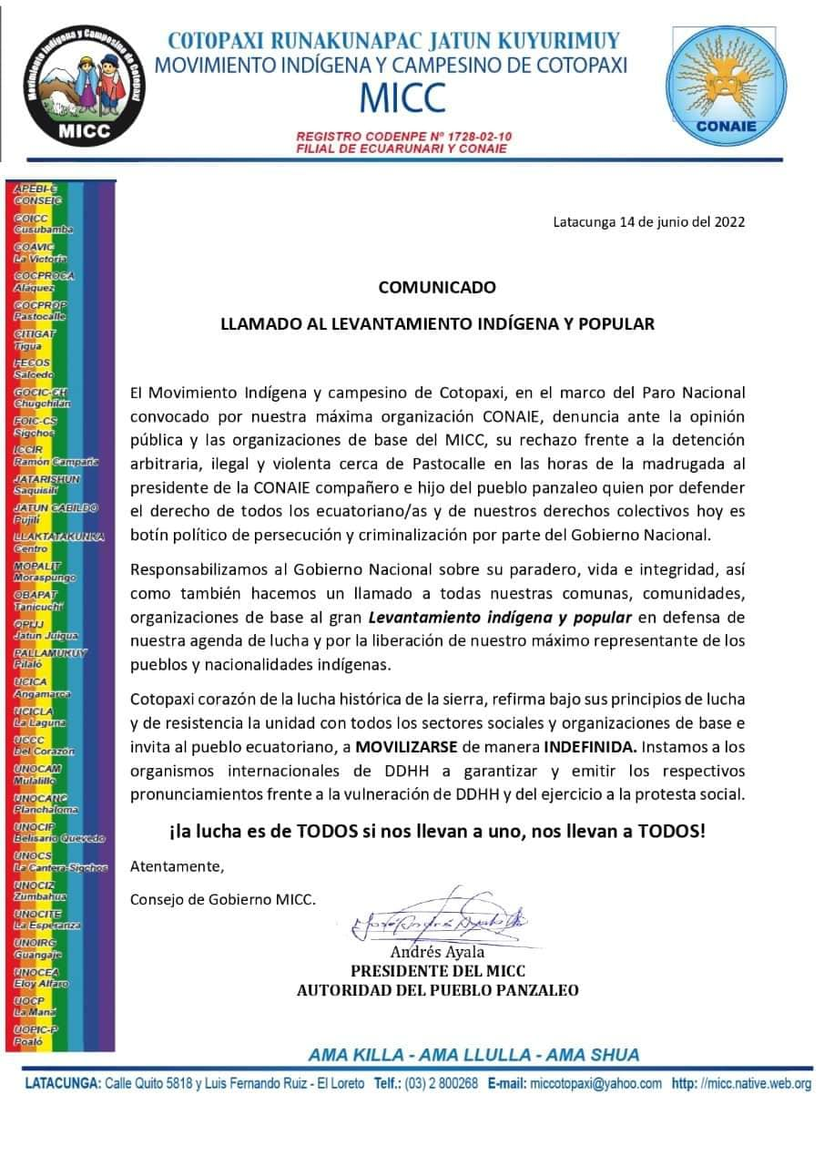 El Movimiento Indígena y Campesino de Cotopaxi se pronuncia sobre la detención de Leónides Iza y hace un llamado a movilizarse de manera indefinida.
