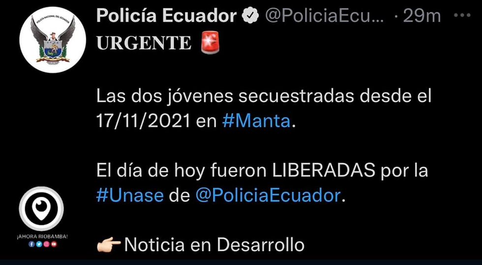 La Policía Nacional confirmó la noche de este domingo 21 de noviembre del 2021 que las dos jóvenes secuestradas en Manta fueron liberadas.