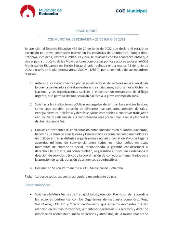 Compartimos las resoluciones emitidas por el COE Cantonal de Riobamba, en sesión extraordinaria realizada este 21 de junio de 2022.
